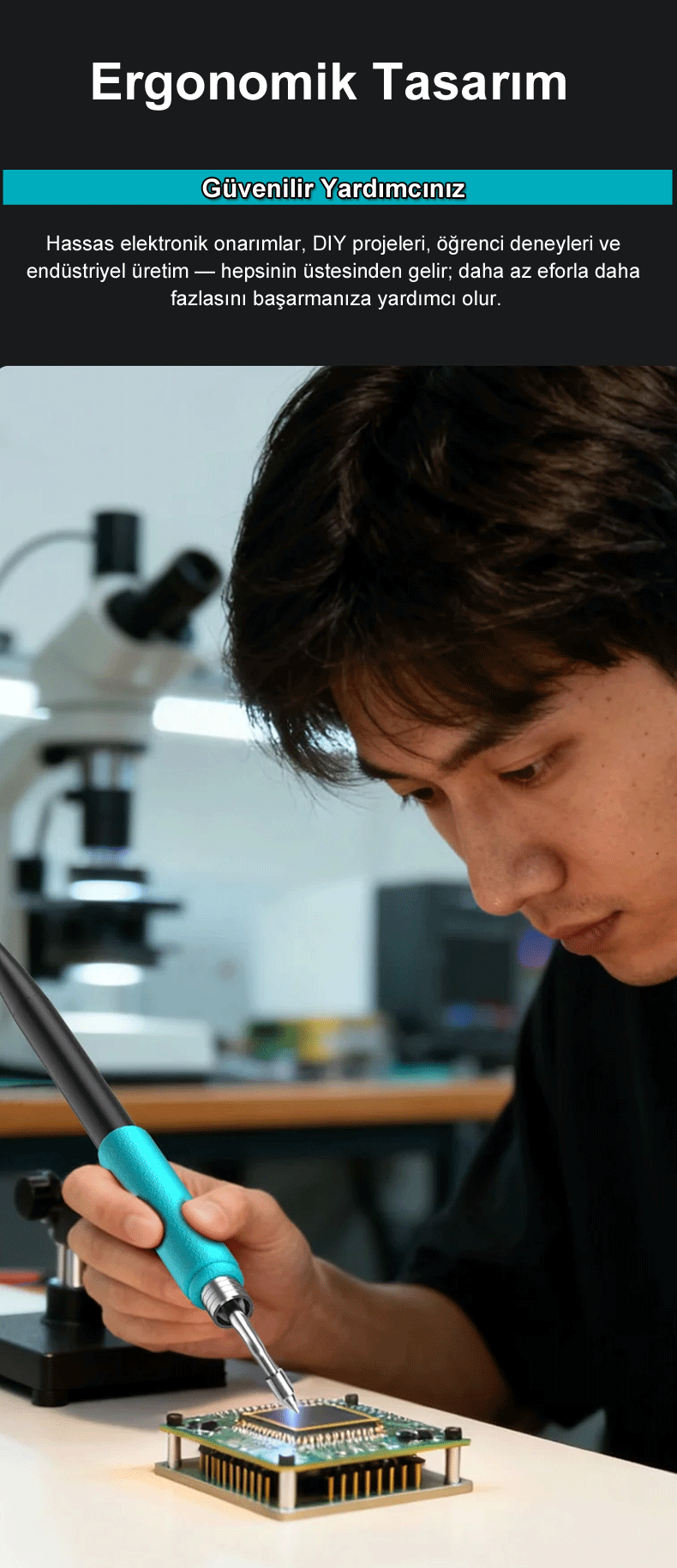 Elektronik tamiri, hobi projeleri, eğitim ve atölye kullanımı için ideal bir tercihtir.