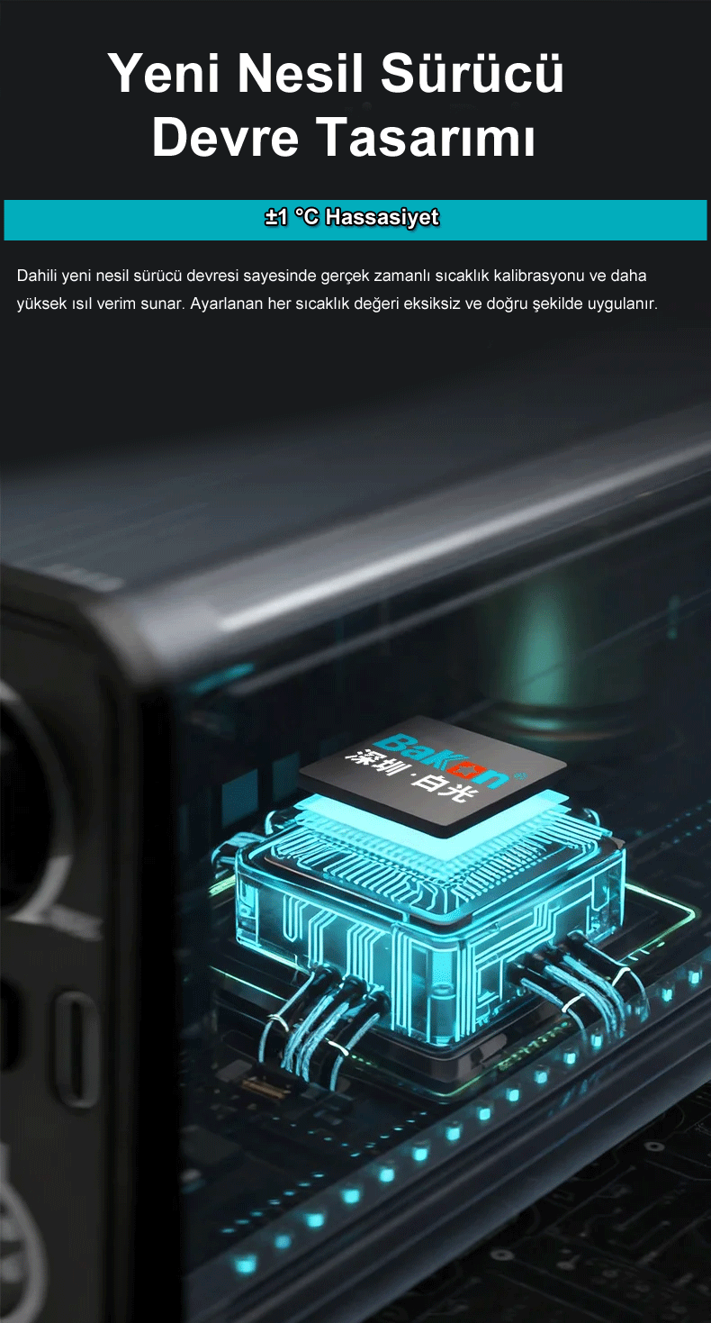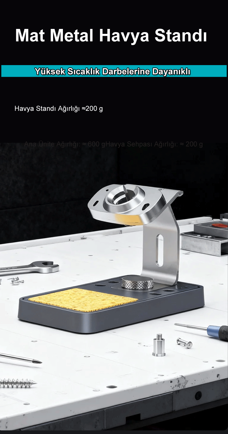 180W ultra hızlı ısıtma gücü ve PID kontrollü hassas sıcaklık ayarı (100°C – 480°C) sayesinde mikro elektronik onarımlardan yüksek ısı gerektiren uygulamalara kadar kararlı ve güvenilir sonuçlar sağlar.